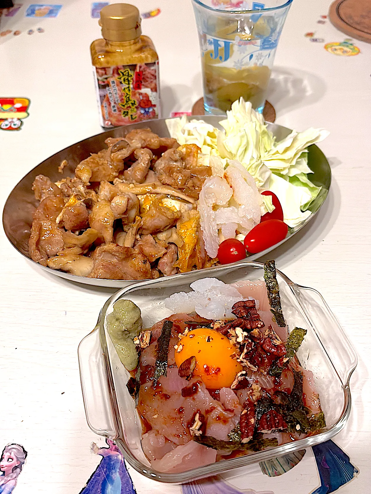 マグロユッケ 鳥ハラミとヤゲン軟骨とキノコの美味しい奴