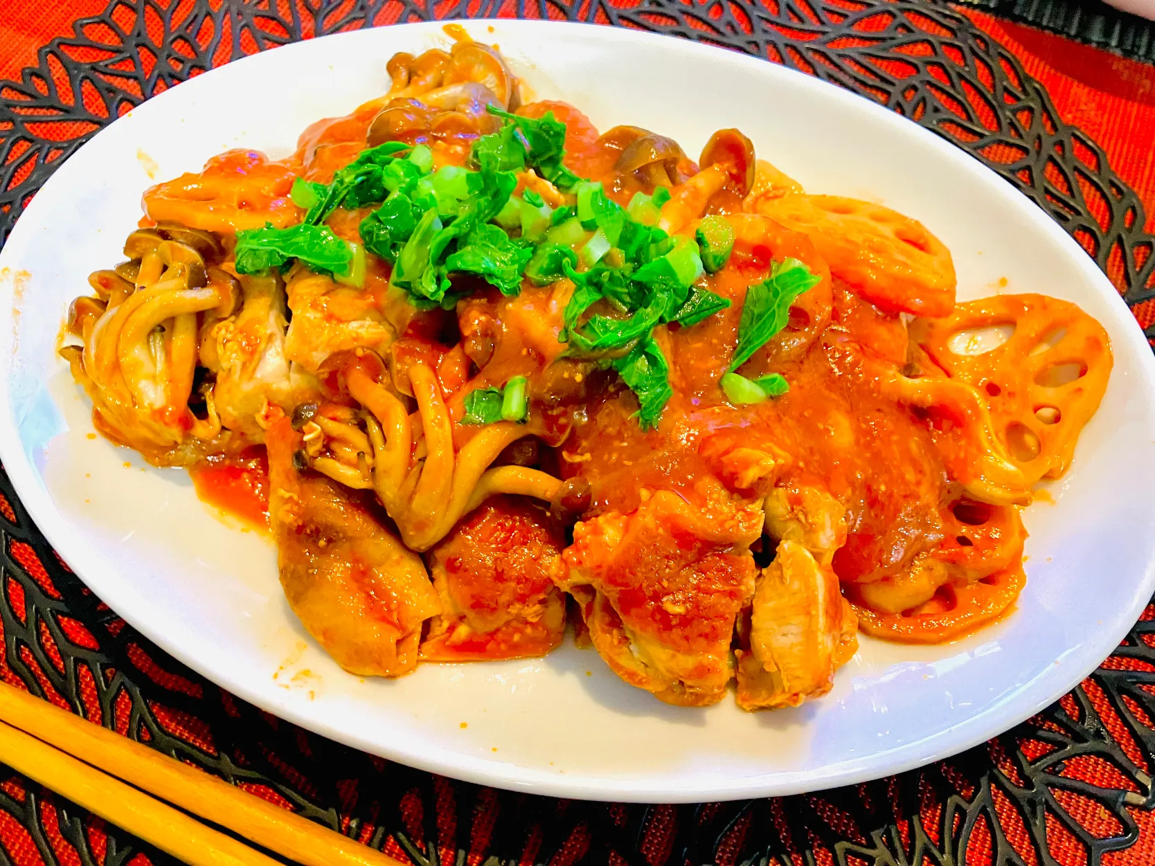 #鶏もも肉 #トマト缶 #デミグラスソース #れんこん #しめじ #大根の葉 #にんにく
