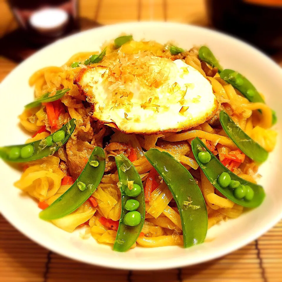 自家製焼うどん!我が家は目玉焼きのっけちゃぃます!そしてピーマンがなくて緑が欲しかったのでスナップエンドウのっけちゃいます!笑