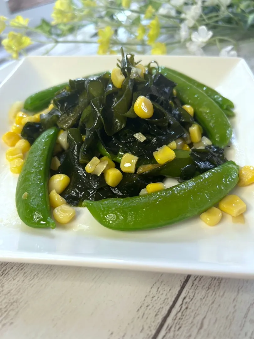 わかめとスナップえんどう、コーンのガーリック炒め。