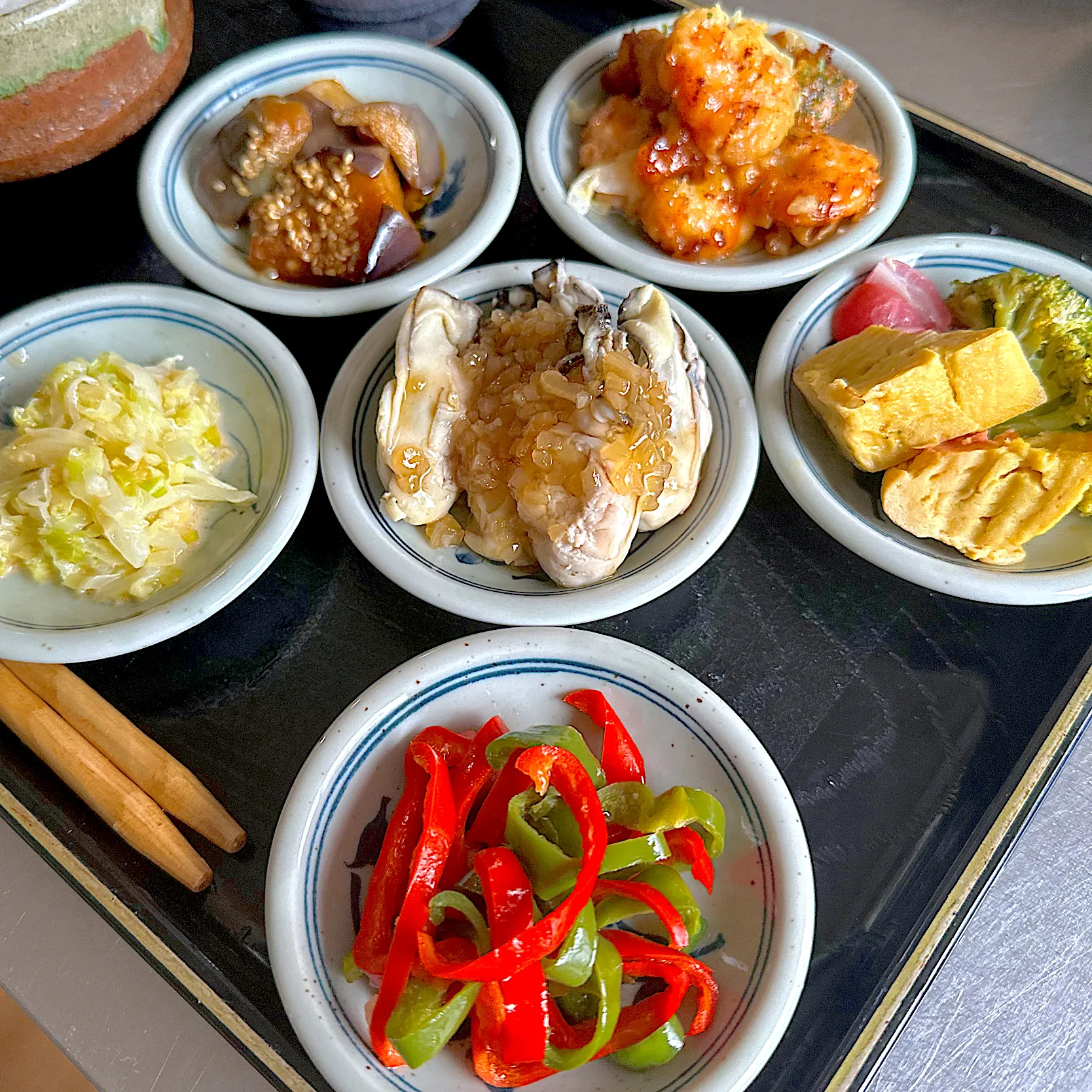 小皿に盛ったおつまみ各種。牡蠣の玉ねぎポン酢、海老マヨ、ピーマンナムル、卵焼き、ブロッコリー、ラディッシュ甘酢漬け、キャベツだけのコールスローサラダ、茄子の揚げ浸し。今日もお疲れ様でした!明日も頑張ろー!