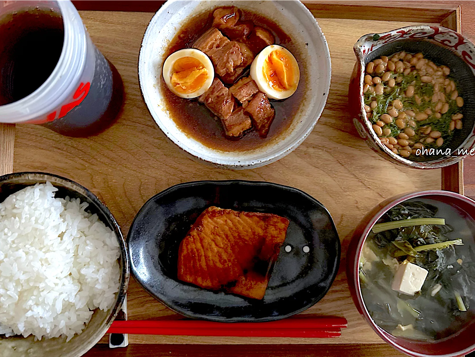 #おうちご飯 #息子ご飯 #和食 #お昼ご飯 #角煮 #メカジキの照り焼き #小松菜のお味噌汁 #めかぶ納豆 #白米
