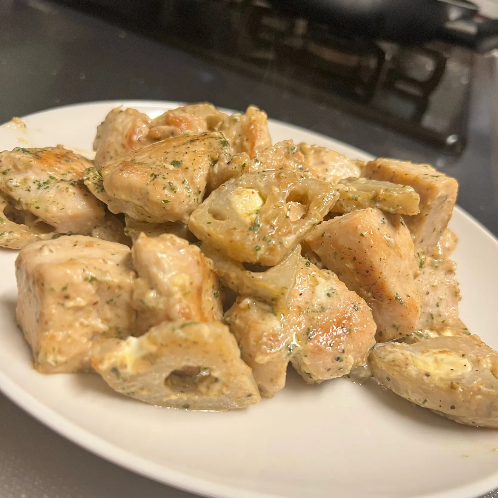 鶏むね肉とレンコンとクリームチーズのクレイジーソルト炒め