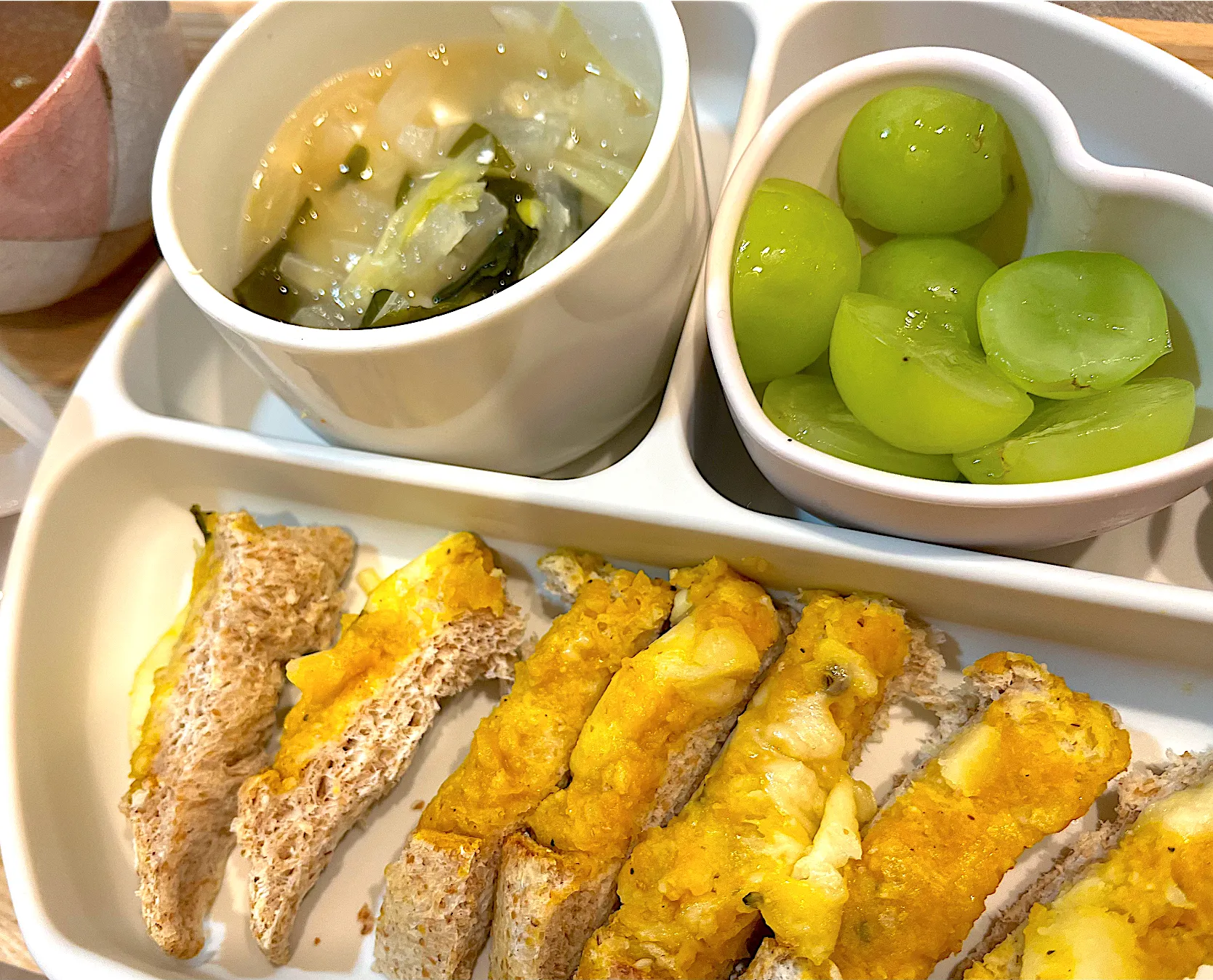 #シャインマスカット #幼児食 #かぼちゃ #チーズ #全粒粉パン #朝ごはん