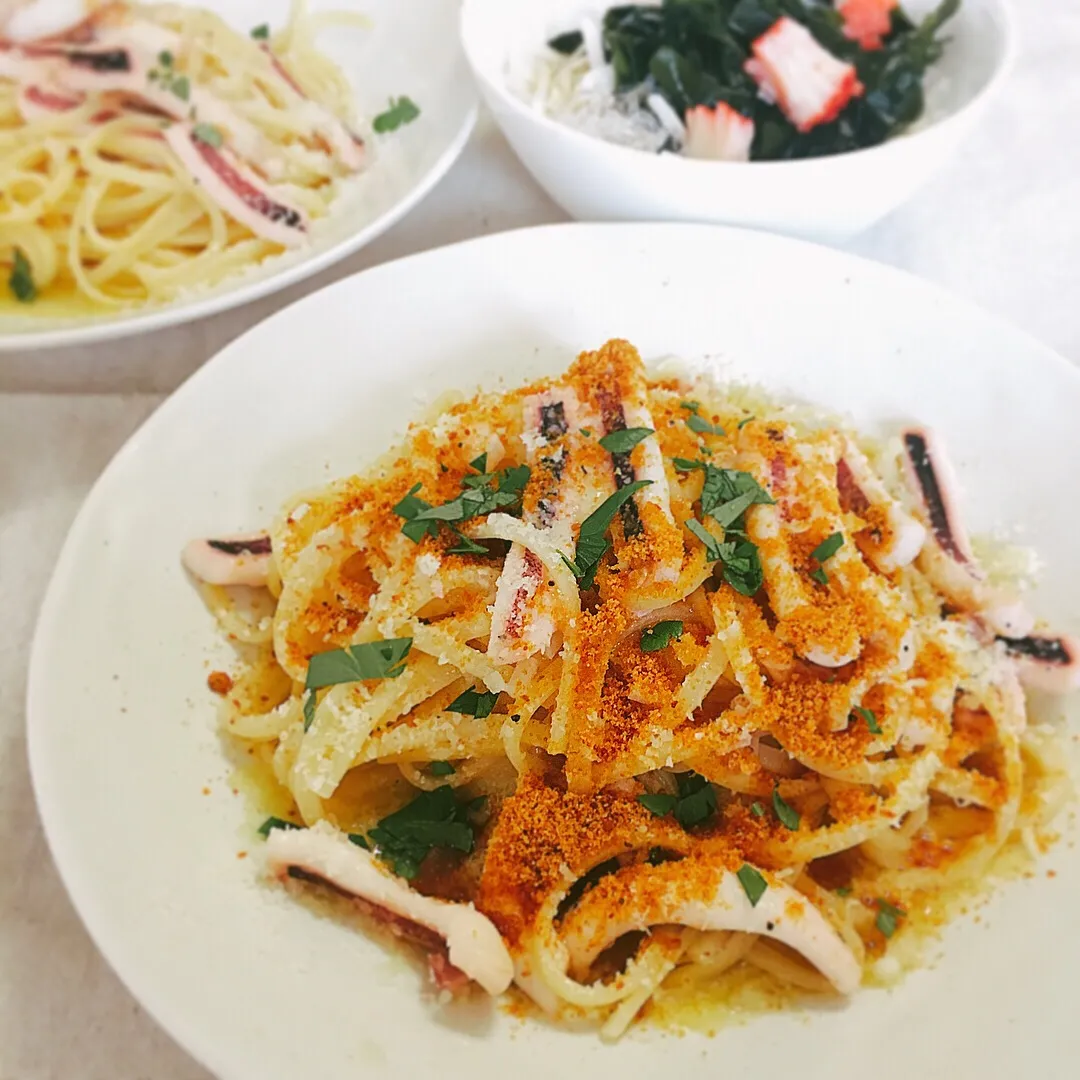 イカとボッタルガ、パルミジャーノの#フェットチーネ #パルミジャーノレッジャーノ #ボッタルガ #パスタ