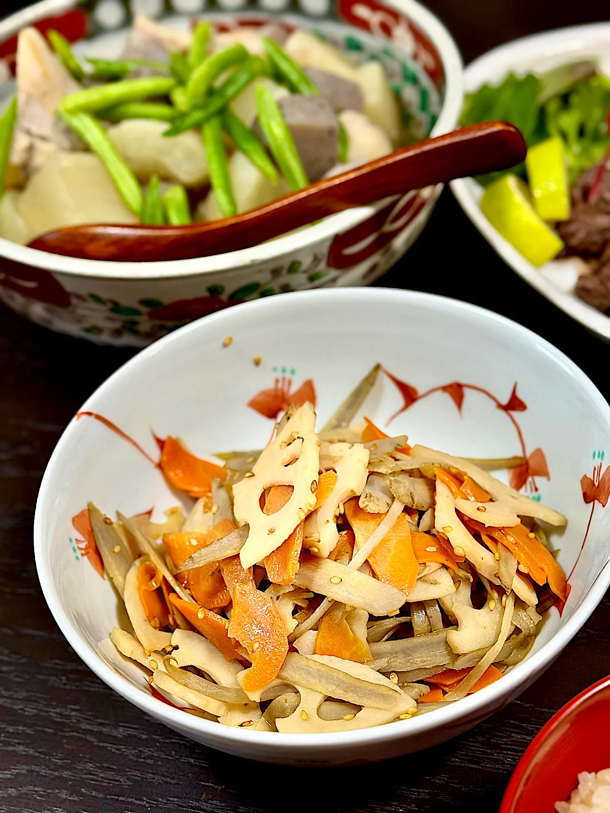 ❆ きんぴら(ごぼう・レンコン・人参・いり金ごま・鷹の爪)(調味料:だし汁、砂糖、酒、味醂、薄口と濃口醤油)