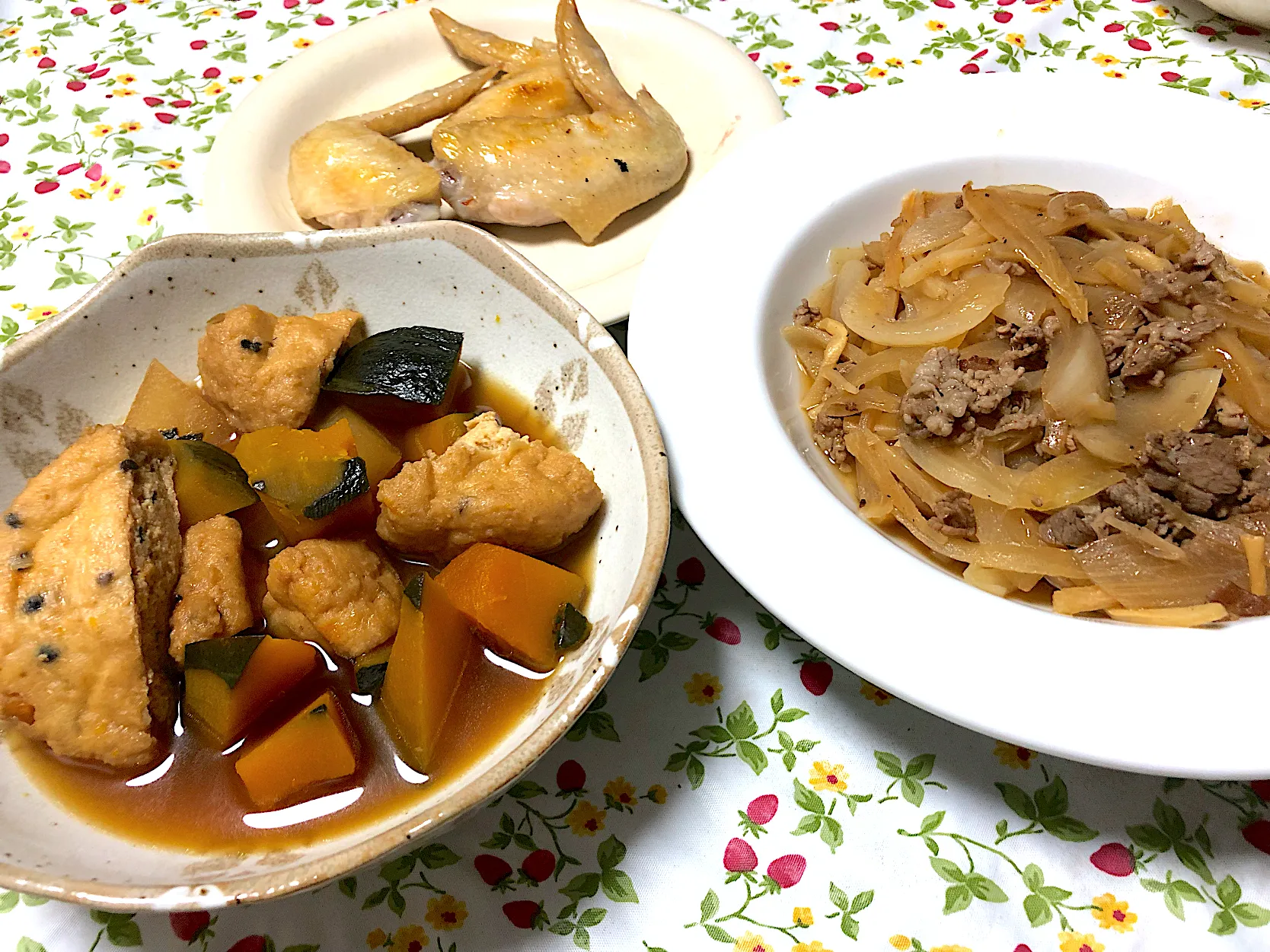 手羽焼き、カボチャ大根がんも煮物