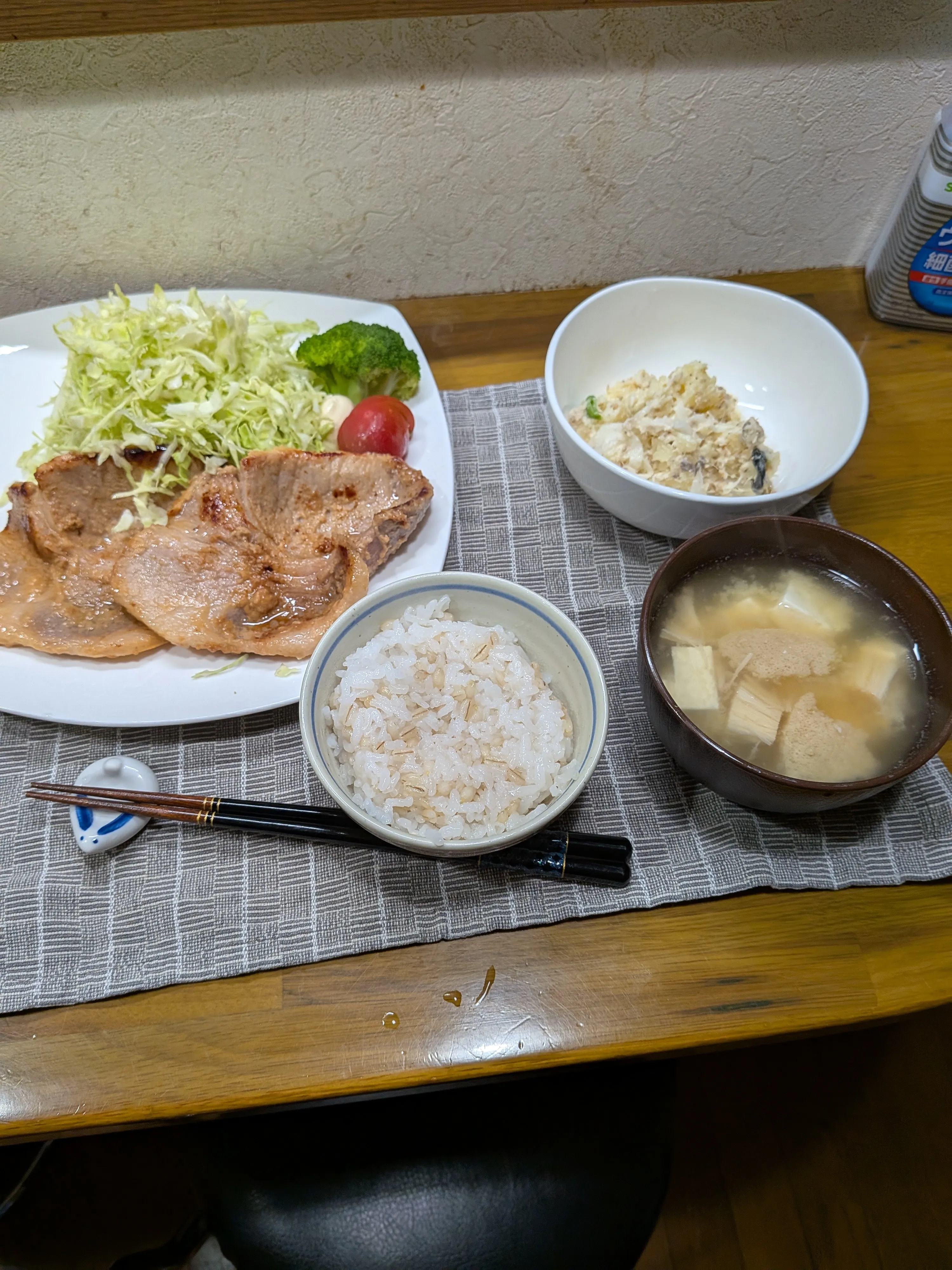 ひじきご飯、卵の味噌汁、豚の生姜焼き、ささみの甘辛焼...