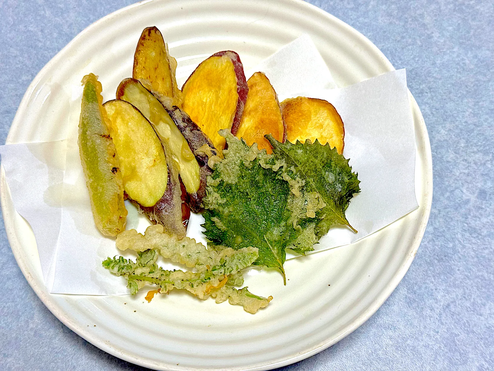 庭の大葉の穂が出始めると「天ぷら食べたい!」って思ってしまう。今回はサツマイモ、ナス、大葉、大葉の穂、オクラを揚げました。 #揚げ物