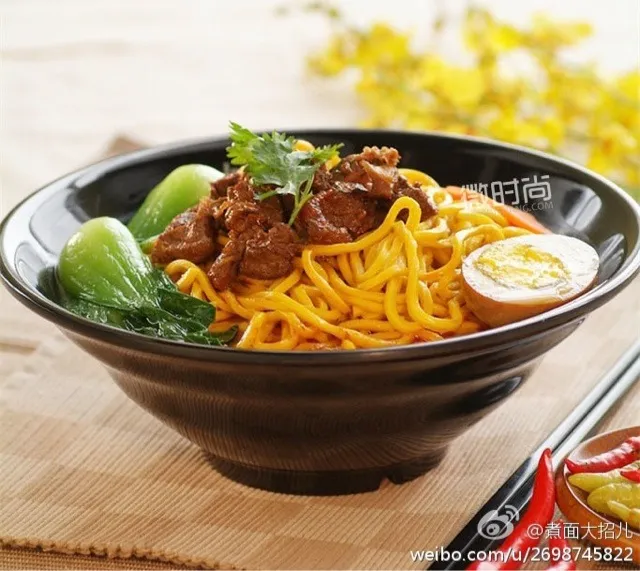 【香辣牛肉面】1.牛肉切块,焯一下捞出;2.起锅热油,加豆瓣酱煸炒出红油,下牛肉,倒足量开水,放盐、老抽、葱姜、干辣椒、桂皮和由花椒、八角、小茴香组成的料包,烧开后转小火炖两小时;3.另锅烧开水,面条抖散入锅煮熟,捞起放入碗里,摆数块牛肉,淋上肉汤, 撒香菜末即可~