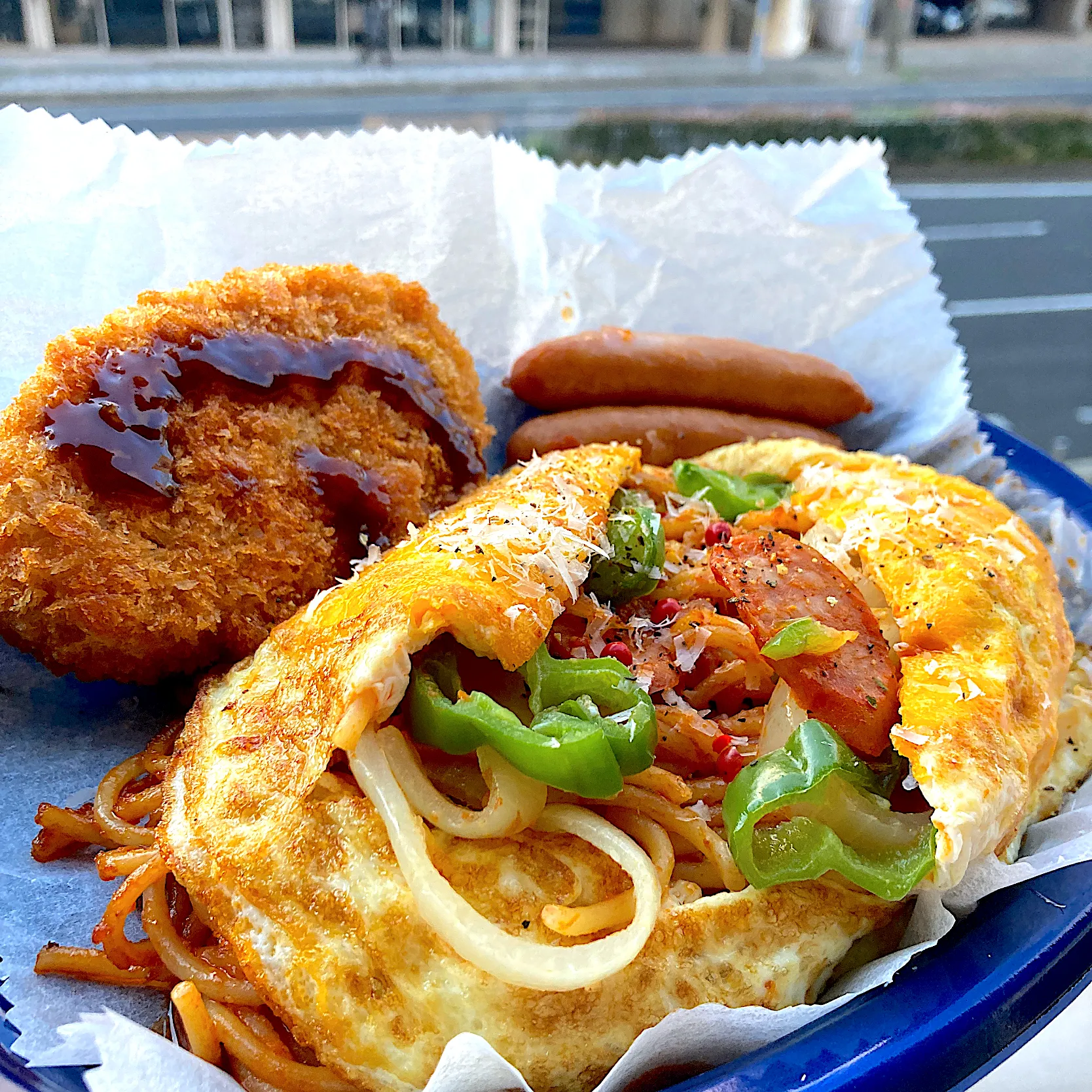 オムにして、ソーセージとコロッケもつけて、ボリューム満点。