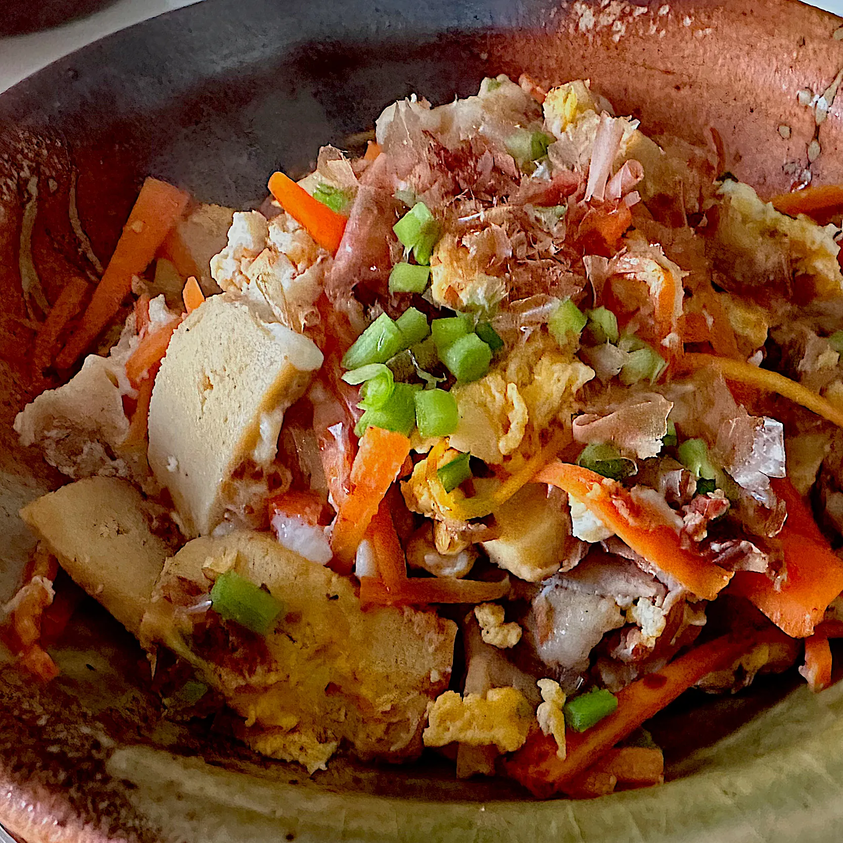 ニンジンシリシリを作ろうと思ったのに、豚肉や高野豆腐、ニラなど、具材追加でいつのまにかチャンプルーのようになっていた(笑)。