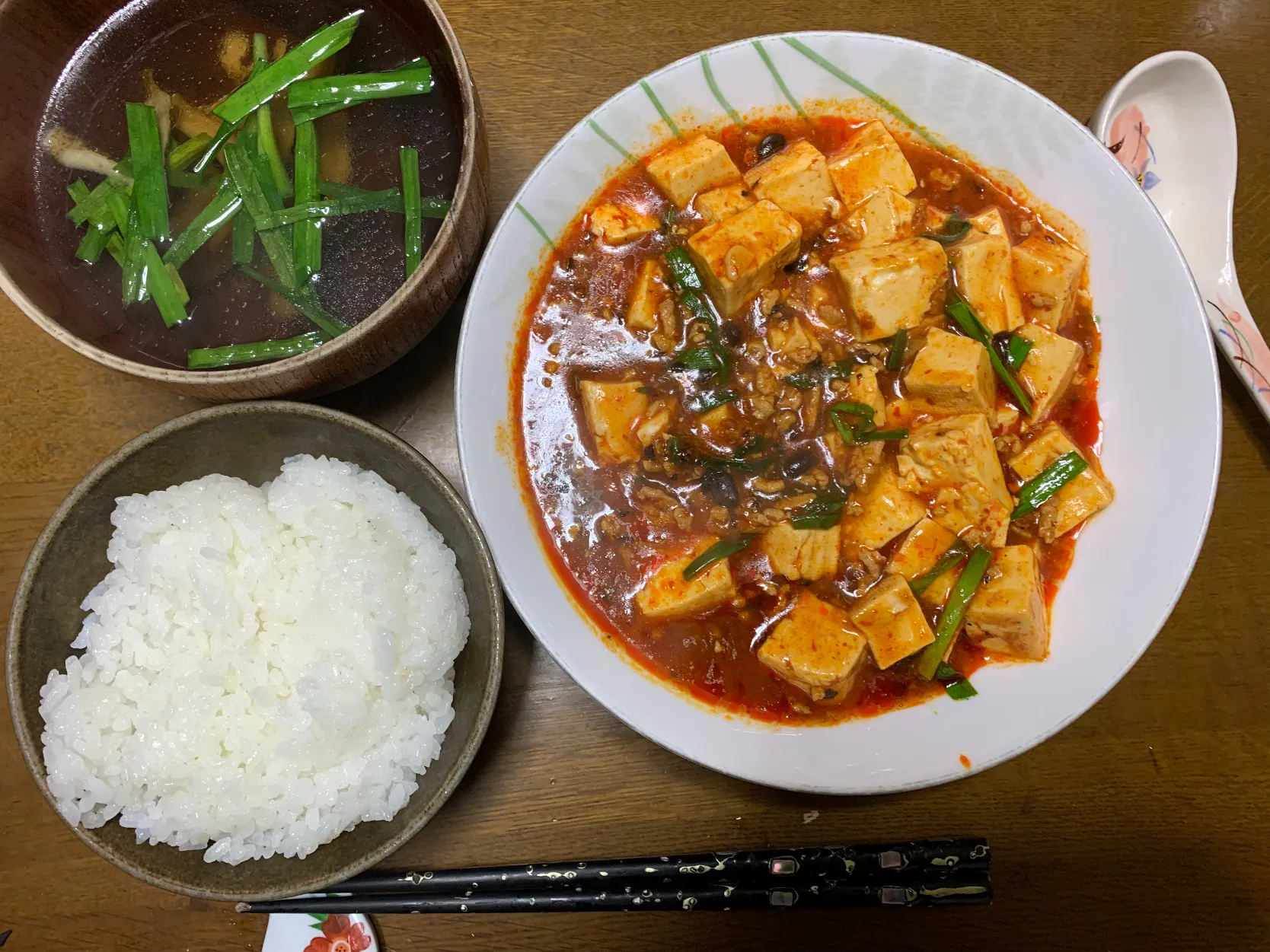 水切りの木綿豆腐ニラ、豆鼓を入れ煮て水溶き片栗粉