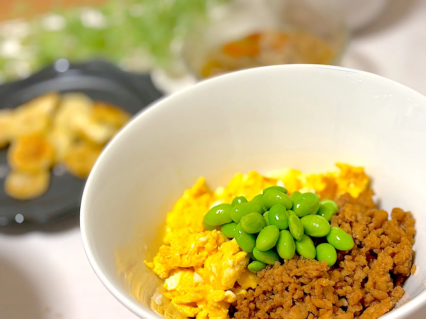 そぼろ丼 がんも煮 レンコンチップ 小松菜煮浸し も...