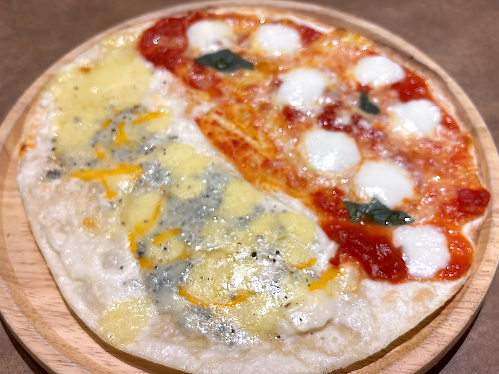 クワトロフォルマッジはチーズがとても美味しい。少しブルーチーズの香りがあるのが嬉しい。はちみつかけて食べるのが嬉しい。プレミアムマルゲリータもかなり美味しい。モッツァレラチーズも美味しいし、トマトソースも美味しい。バジルの香りがするのも嬉しい。AA