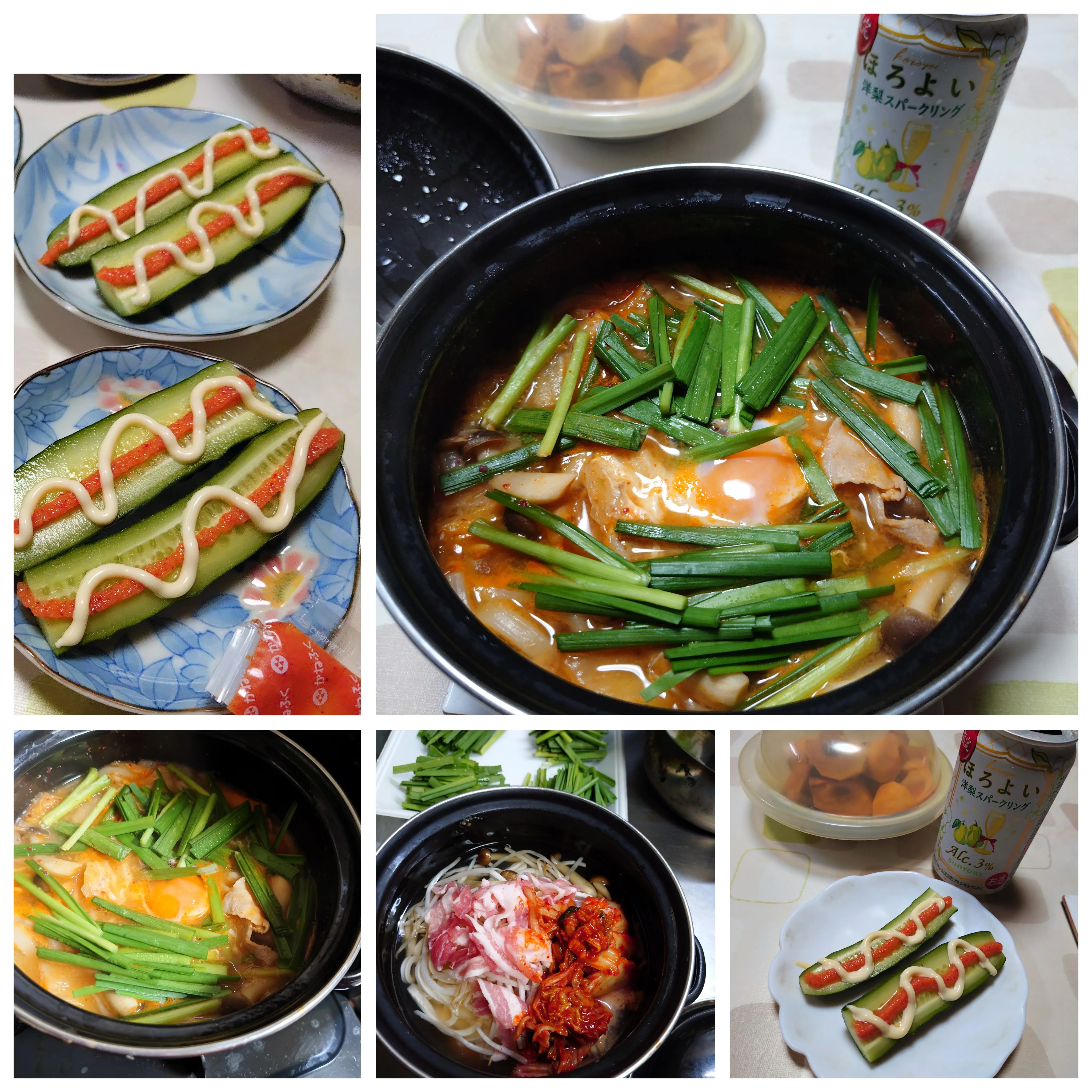 #豚キムチ#キムチうどん#キムチ#ニラ#明太子#きゅうり#豚バラ#うどん