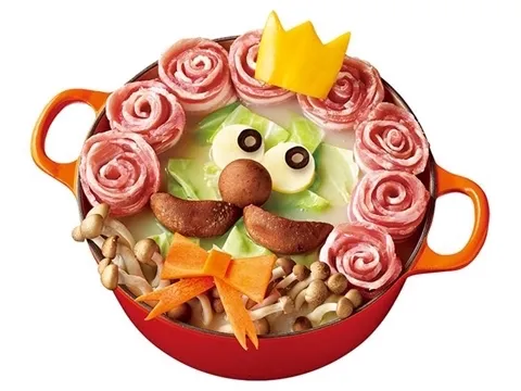 きのこ鍋の王様、トリュフ大王が可愛い肉鍋です。豚ばら肉をくるくると巻いたり、にんじんのリボンやマッシュルームのヒゲを作ったり、みんなで作って楽しいパーティーにおすすめです。チーズとトリュフの贅沢なコクの「ヤマサ 匠鍋 トリュフ香るチーズ肉鍋つゆ」はまろやかな味わいで、赤ワインにもよく合います。
