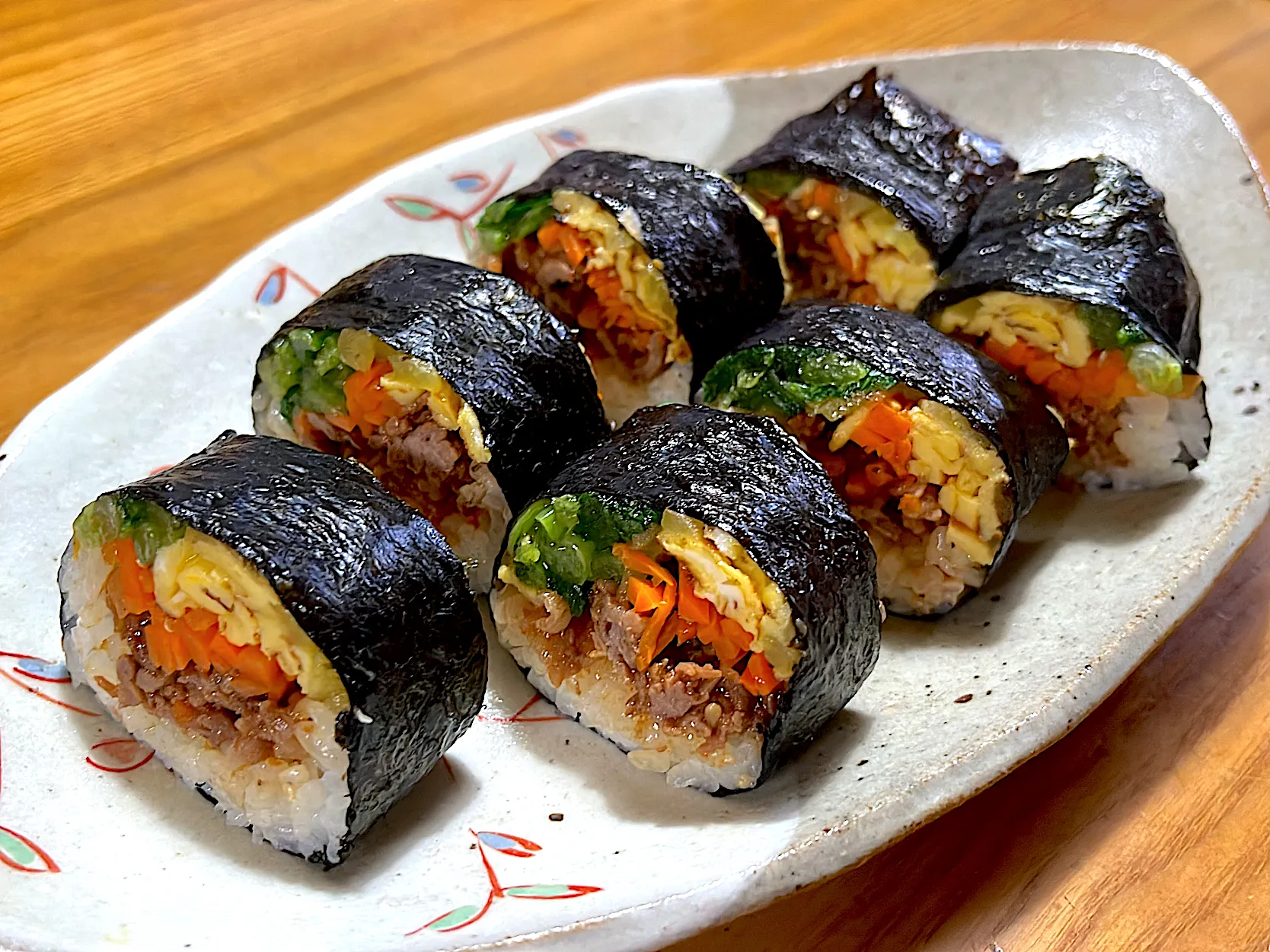 最近ハマってる!キンパ風巻き寿司、マカロニサラダ、白...