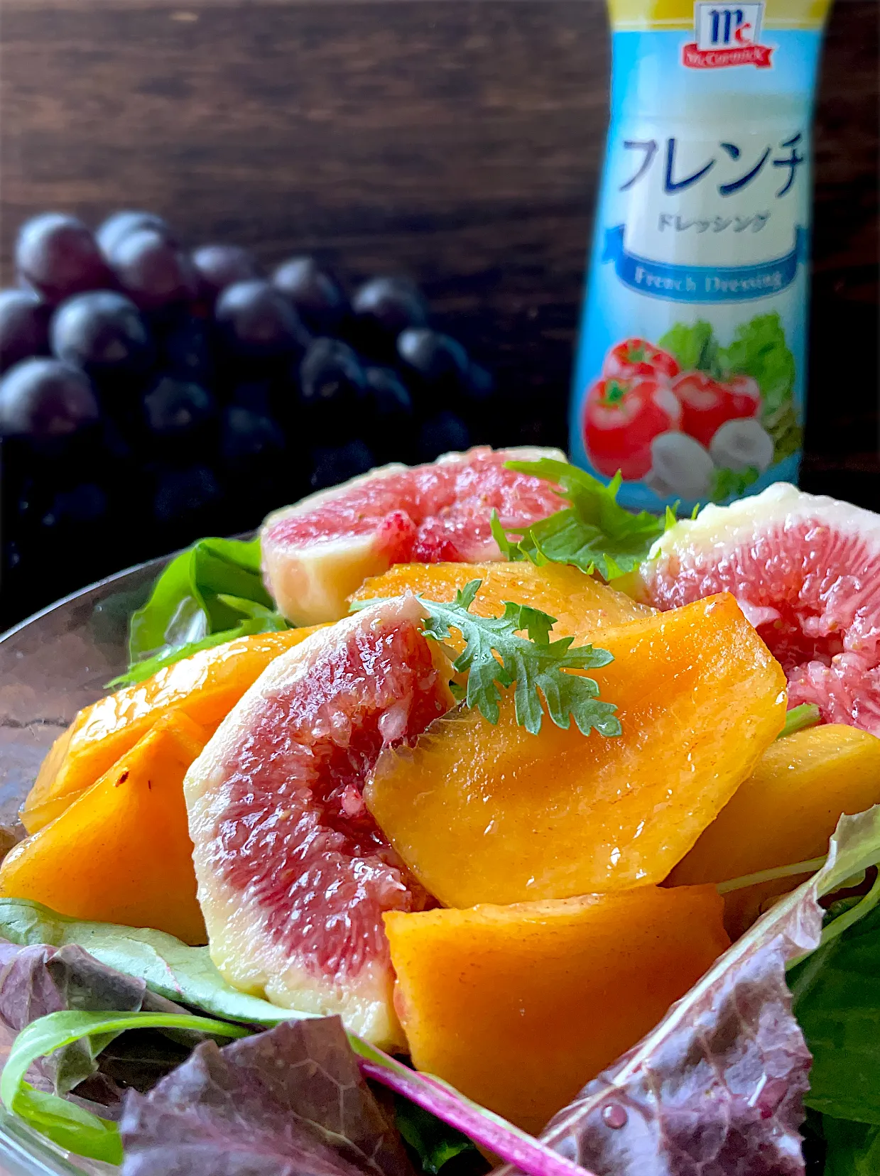 #snapdish #ユウキ食品#おいしい世界ごはんパートナー #世界調味料パスポート #フレンチドレッシング #ドレッシング #柿 #いちじく #フルーツサラダ #ベビーリーフ