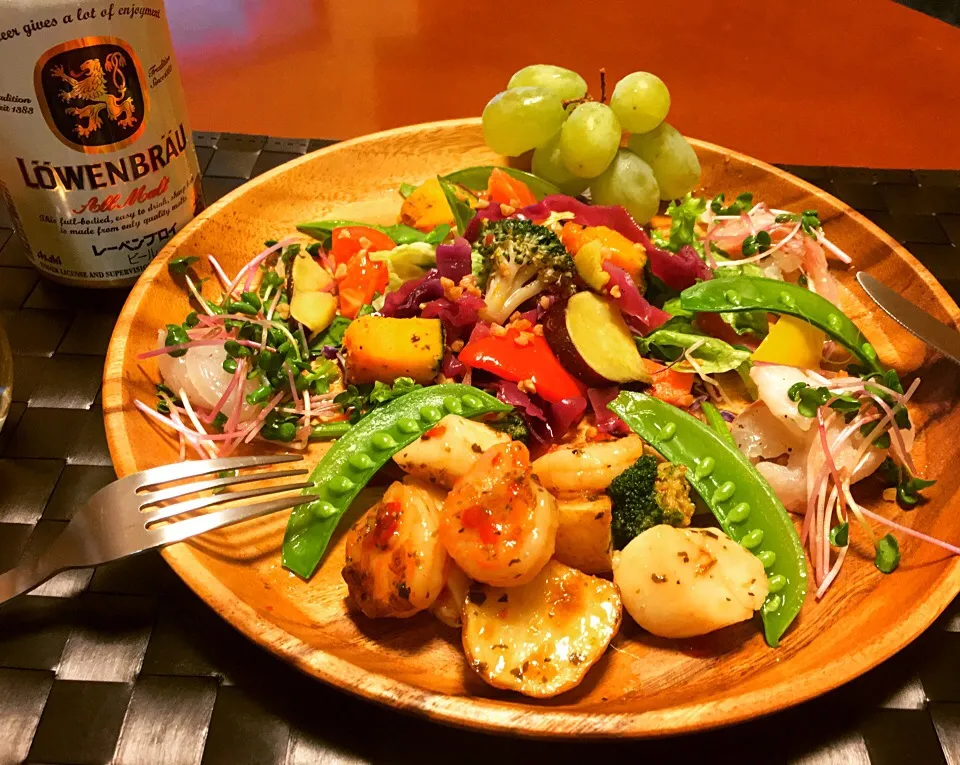エビとホタテのガーリック炒め☆と根菜ソテー☆鯛のマリネ☆