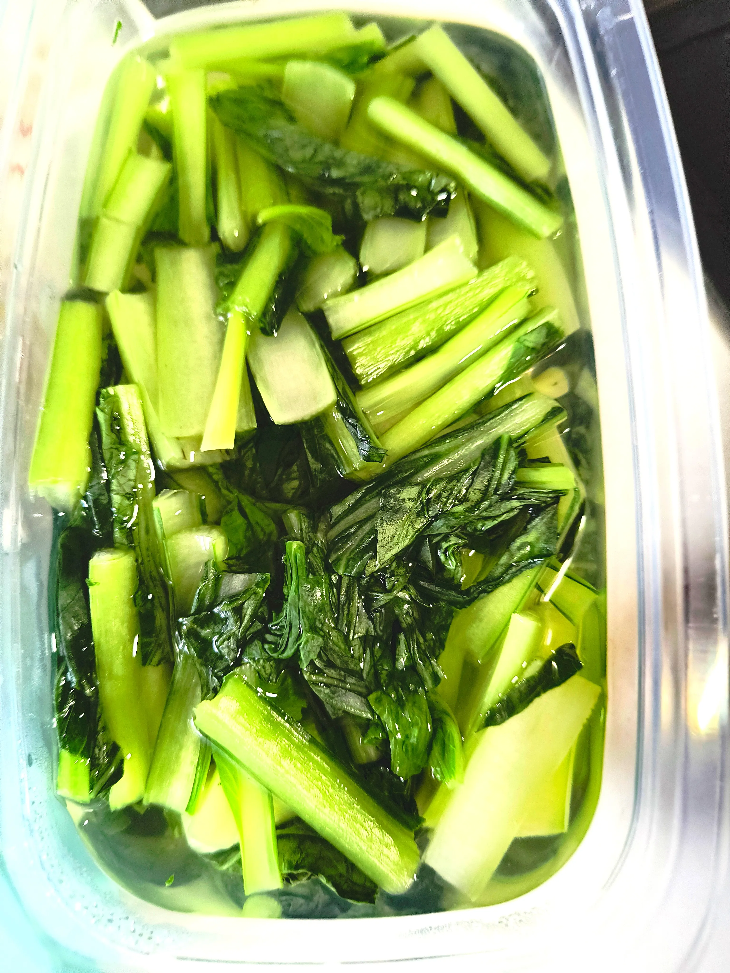 小松菜を塩水でさっと茹でるだけ。塩水に入れたまま冷ます。