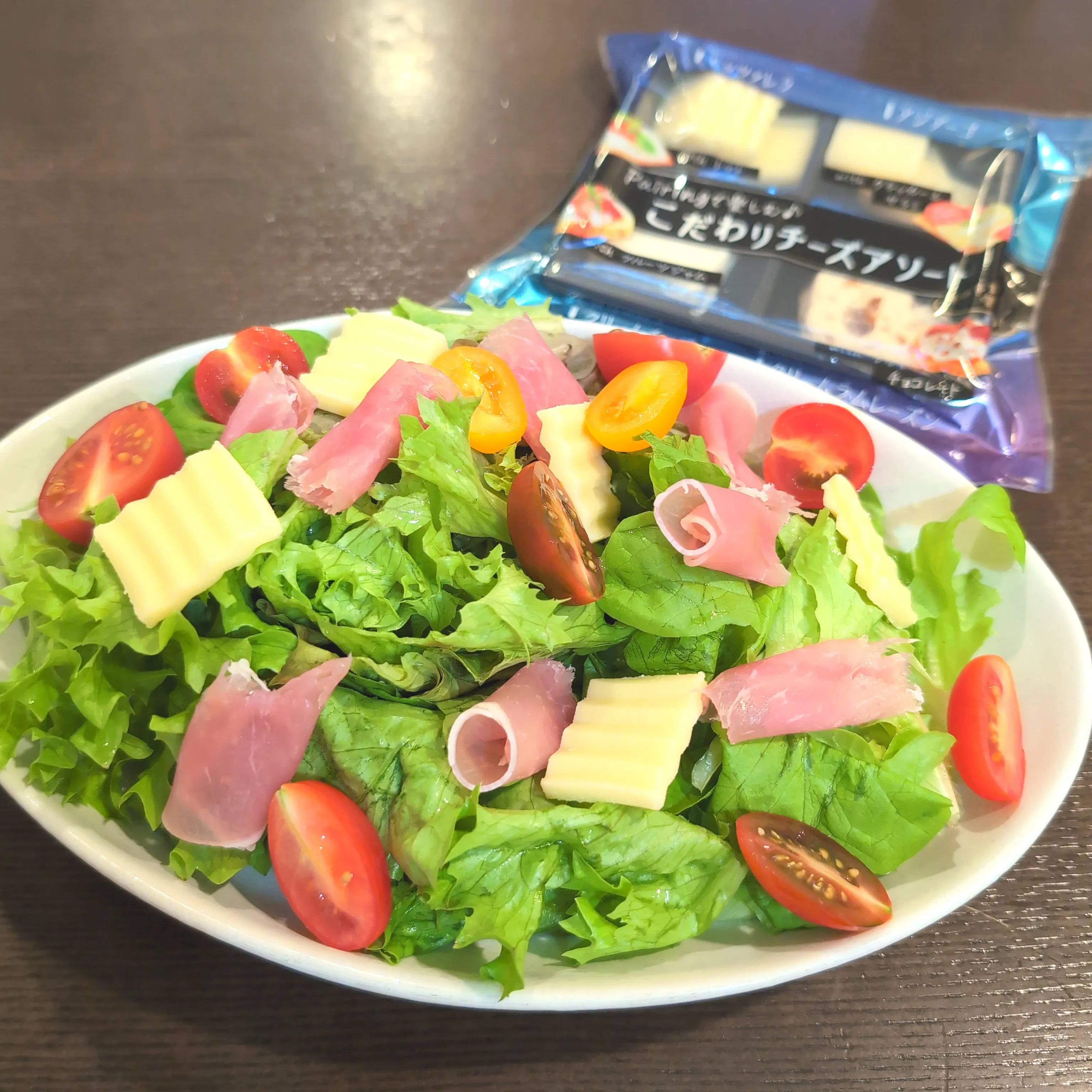 こだわりチーズアソートの中からモッツァレラをサラダにのせてみました。