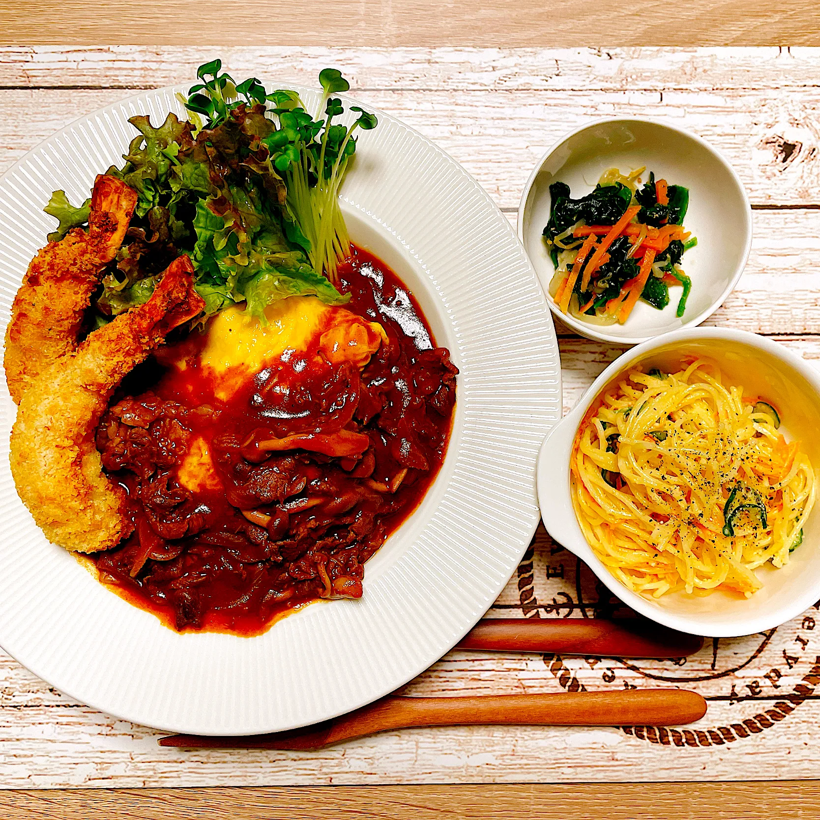 #晩ご飯 #ハッシュドビーフ #オムライス #焼く/炒め物 #エビフライ #エアフライヤー #高カロリー #デブ活 #洋食