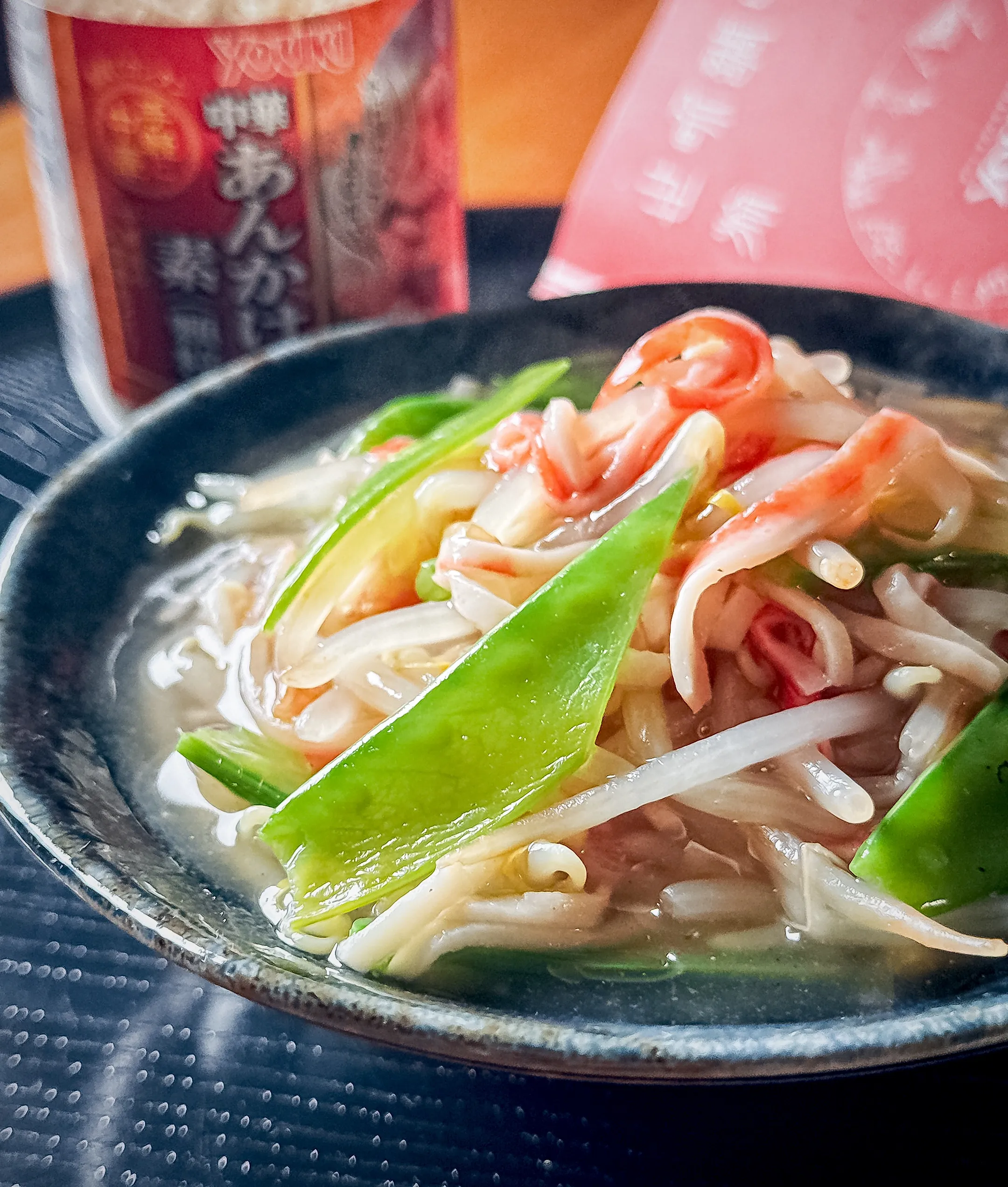 規定の分量に対して少なめに入れたけど、もやしとカニカマと、絹さやなのであっさり具材なら少なめでも十分美味しく、多少水の分量が多くてもちゃんととろみはつきましたよ(๑•̀ㅂ•́)و✧