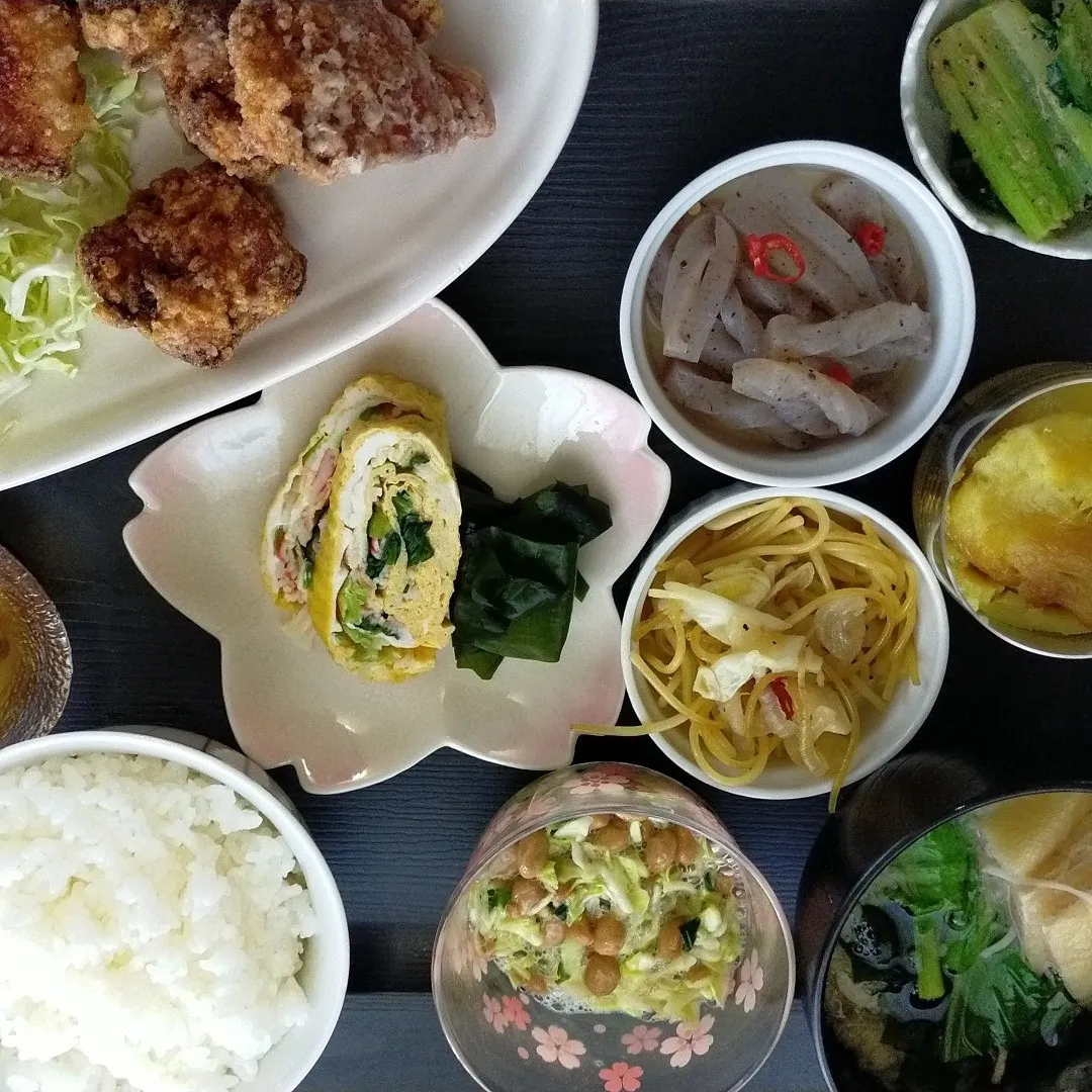 キャベツ、玉ねぎ バター醤油、八方だし、悪魔の唐辛子、ニンニクで和風ペペロンチーノに仕立てた。