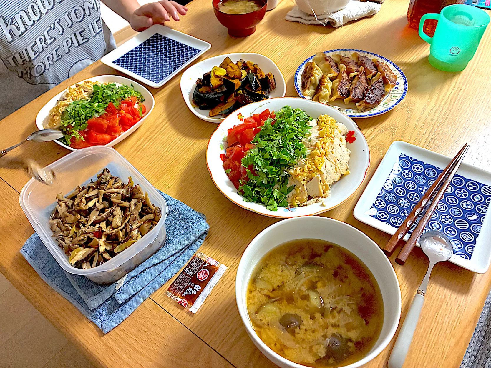 カオマンガイ、浜松餃子、きのことれんこんのピリ辛マリネ、かぼちゃのにんにく炒め、茄子と大根のお味噌汁。