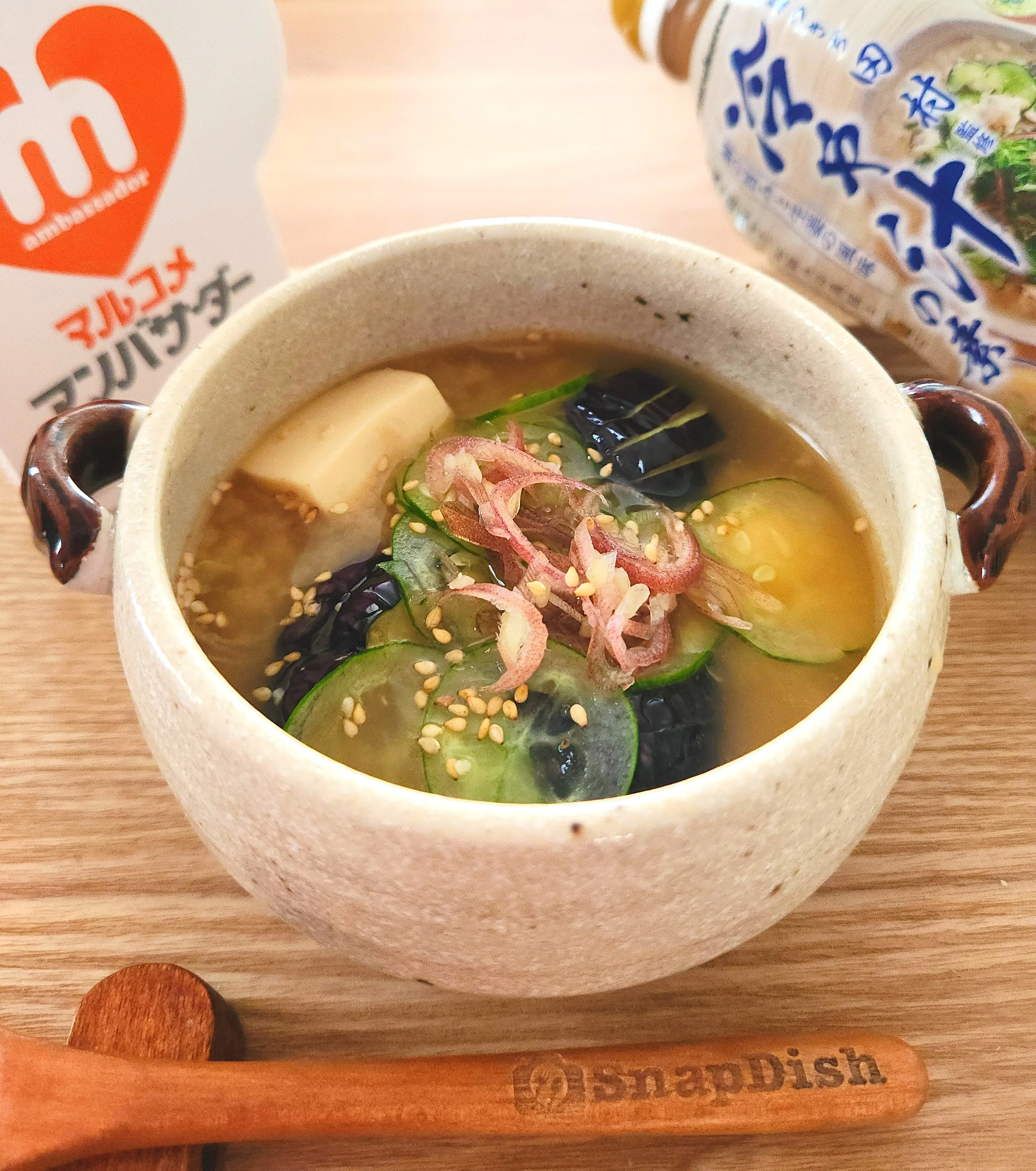 夏野菜を入れて、ご飯や素麺にも合いますが、今回は揚げ茄子入りで🍆