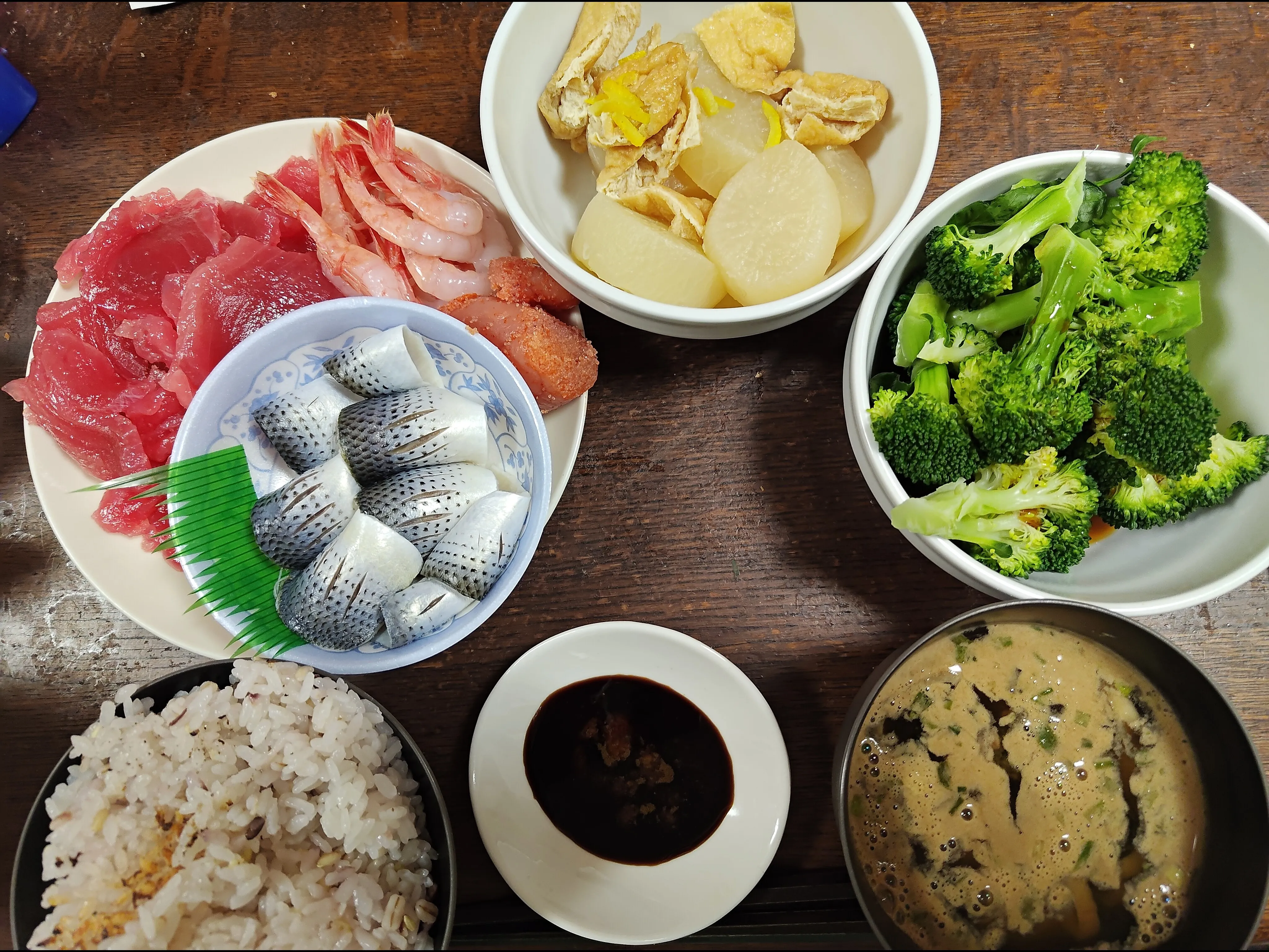 お刺身盛り合わせ、里芋と鶏肉の煮物、煮豚と味付け玉子...