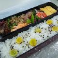 玄米ご飯 梅干し 水菜入り海老マヨ ミートローフ かぼちゃの煮付け 蓮根の青海苔...