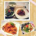 Snapdishの料理写真:今日の夕食 牛肉とごぼうの炊き込みご飯、れんこんの塩焼き、ミニトマトのタルタルソース焼き、豆腐とわかめの味噌汁