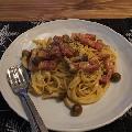 ポークチャップ 下にスパゲティ入り 玉子焼き じゃが芋 ピーマン 人参のソテー ...